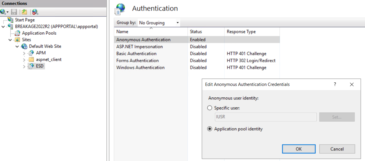4. Set Anonymous Authentication Credentials to Application pool identity.