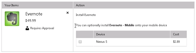 • Requesting a desktop catalog item—If a user adds a desktop catalog item that is linked to a mobile catalog item to the cart, the user will be informed during checkout that they can optionally install the mobile catalog item onto their mobile device: