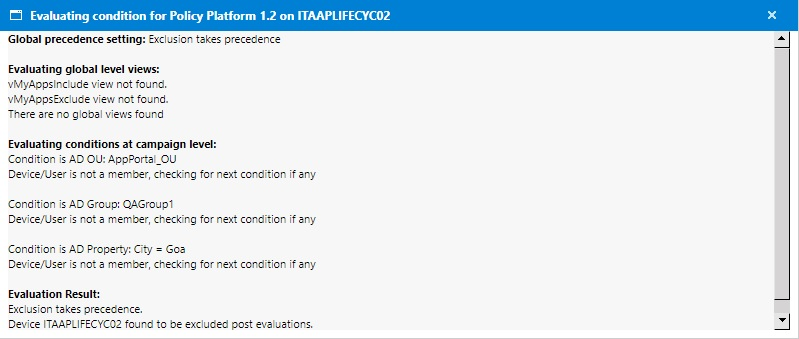 • The Is eligible for Alerts? column provides a link with Yes/No values and indicates whether the device is eligible for processing the alerts or not based on the conditions defined for that campaign. Clicking this link opens an Evaluating condition for <application name> on <device> pop-up with detailed information on eligibility as shown following: